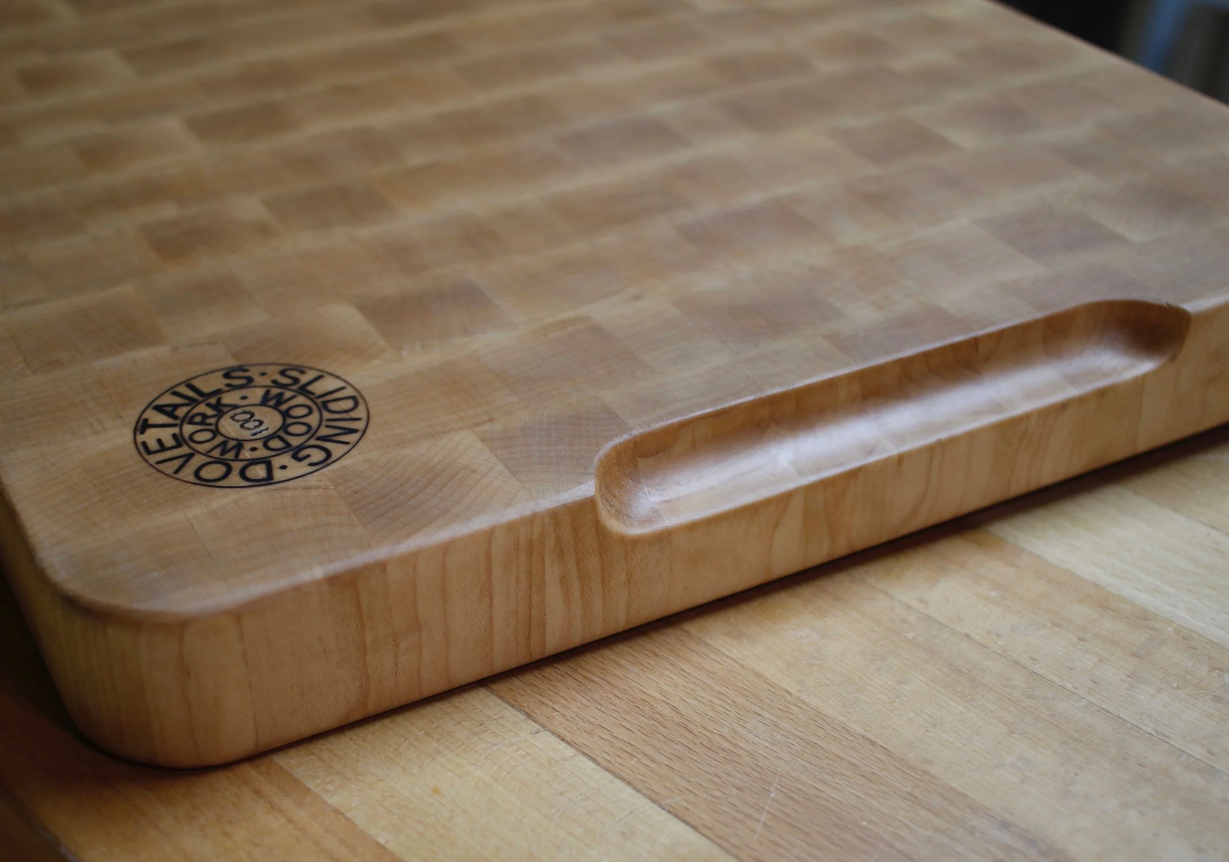 A solid hard Maple end-grain cutting board with finger grooves on both ends. This board can be used on both sides as it has no feet. Measurements: Length 50.5cm X Width 37.5cm X Height/thickness 38mm. This board comes with a 4oz tin of mineral oil/beeswax board conditioner.